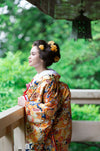 紺地に金糸で縁取られた毬や四季折々の花々が描かれあたたかみのある打掛です。