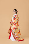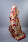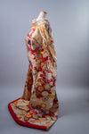 牡丹、毬、扇面などの吉祥文様を配した愛らしい打掛です。 つややかな緞子地に数多の紋様を様々な箔や色糸を用い織り上げました。 定番の古典柄でありながら、どこかアンティークの雰囲気のある打掛です。