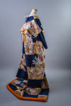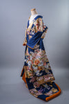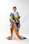 銀糸の織り込まれた紺地に金色の市松模様が煌めく優美な打掛です。