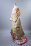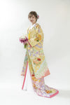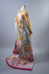 雄大な富士山の裾野の 情景に、辻が花調の花々を 配し友禅と総絞りでスケールの 大きさ、春のうららかな優しさも同時に感じさせる魅力の一着です。 霞の金駒刺繍、峰の稜線に銀糸の刺繍がほどこされており、絞りの立体感に重みと奥行きが感じられる色打掛です。