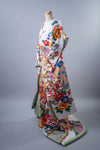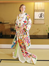衣裳全体に伸びやかにたなびく几帳と、牡丹、菊、梅さらに鳳凰や風景を雪輪にあしらった打掛です。