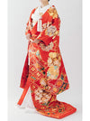 縁起の良いことが輪つながりで広がるおめでたい七宝文様に松竹梅や穏やかな幸せを表す青海波が描かれています。 花嫁の幸せがいつまでも続くように願いを込めて制作された赤地の美しい打掛です。