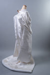 梅・桜・藤・などの紅葉の四季折々の草花が咲き誇り、上品で優雅な白無垢です。優雅に天高く翔ける鶴と、御所車や流れる水の様子が華やかで優雅な雰囲気を醸し出しています。角度から格調ある文章様を炊きます。
