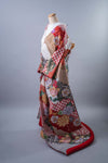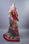 幾重にも広がる雪輪文様、赤、水色、白、黄金に染め分けられ全てが鹿の子絞り文様で仕上げられています。 その中に七宝や市松、霞、鹿の子、麻の葉文様が所狭しと加工され蓮や橘が先、たっぷりの文様が饗宴します。 職人の手で丁寧に時間を掛けて仕上げられた打掛です。