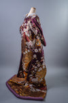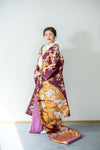 咲き誇る桜とダイナミックな流水柄が豪華で、色の対比も美しい打掛です。 落ち着いた紫地に金銀の箔が織り込まれており、しっとり艶やかな雰囲気でお召し頂けます。