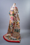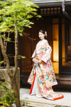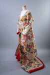 悠久の時を感じさせる金の流水に、色どり豊かな四季の花々が咲く中、優雅に舞う鶴。 慶びの日の着物として最高の花嫁を演出しています。