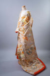 優しいサーモンピンク地に、ねじり梅文様、七宝や愛らしい花々、雪輪文様が全体に描かれた豪華な色打掛です。