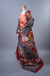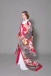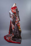 晴れやかな紅に手書き友禅の華やぎ、紫がかった鶯色に、染まらず美しく並ぶしぼりの本疋田絞りの白が特徴です。