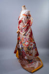 全体に伸びやかに描かれている、長寿の意味をもつ「若松」が凛とした雰囲気を醸し出しています。 伝統的で格調高い文様ながらも、丸みを帯びたフォルムのデザインも配されており、寿ぎの趣があふれる、晴れやかでおめでたい印象の打掛です。