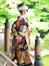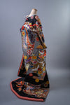 総絵羽で衣裳全体に織疋田で檜扇をあしらい、鳳凰、貝桶、束熨斗、鶴、花籠、四季の花々に割付け文様と息をつかせぬほどの吉祥文様が賑やかに盛り込まれた贅沢な打掛です。