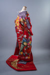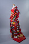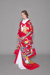 「几帳」は王朝時代の憧れと美しさ、華やかさを表す吉祥文様です。 衣裳全体に几帳が伸びやかにたなびき、見え隠れするように描かれた霞の中から羽ばたく琳派鶴や菊、梅の花、疋田の霞がアクセントの雅な雰囲気の打掛です。